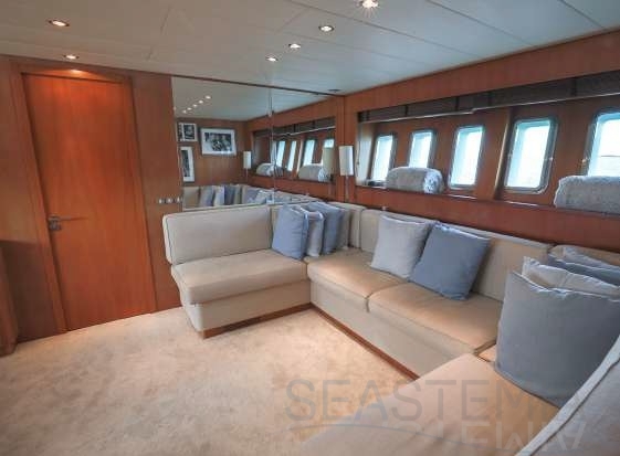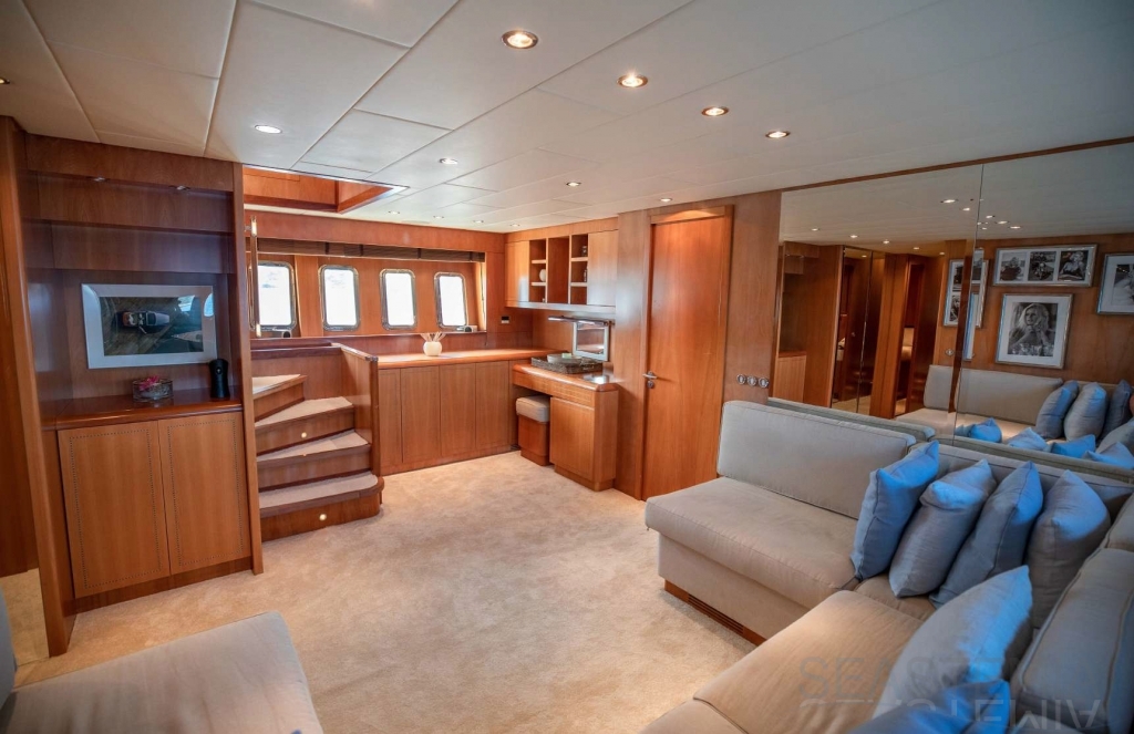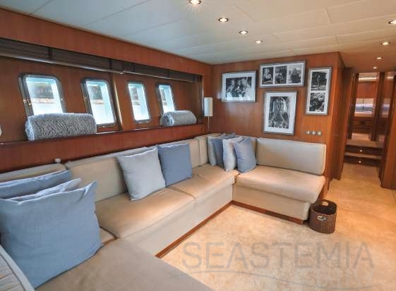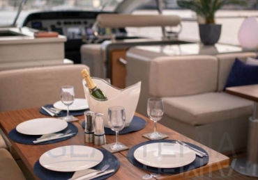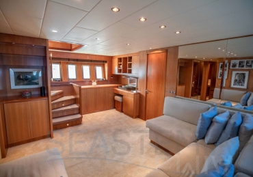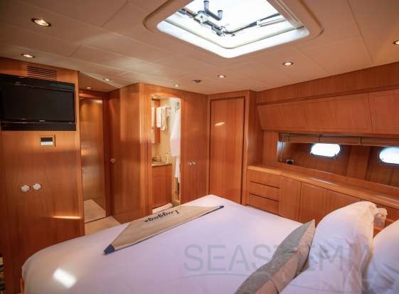 The deck saloon offers a luminous formal dining area with comfortable seating. The main saloon is set in light tones enhancing the relaxed atmosphere that can easily imitate a movie theatre with a large TV screen and an adjustable sofa.