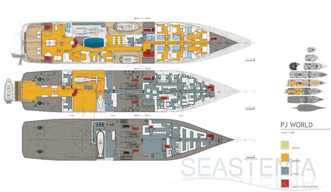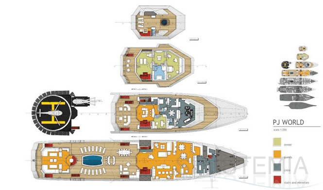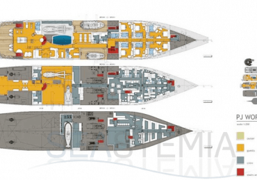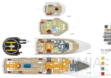 Superyacht PJ World has been designed for greater fuel and energy efficiency in keeping with current ecologically ‘green’ trends in yacht design. Her hybrid propulsion system offers captains a variety of power options and the possibility to adjust the use of mains and auxiliaries according to speed requirements and weather conditions.