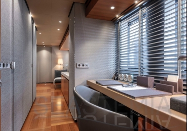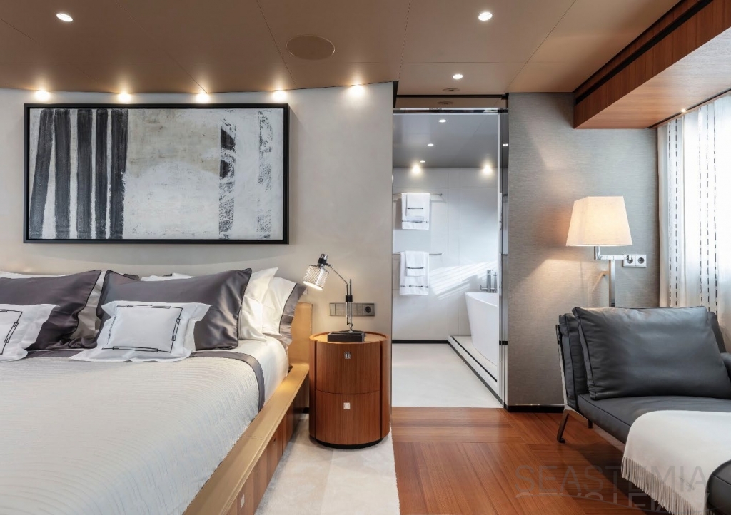 The full master suite located on the main deck features modern minimalist vibe and opens into an elegant private study.