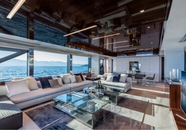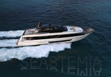 The Riva 110 'project, Riva’s new fiberglass flagship, is a promise of style, design and performance to reach levels never seen before. Through the collaboration between Officina Italiana Design, the studio founded by Mauro Micheli together with Sergio Beretta, the Ferretti Group Product Strategy Committee, and the Engineering Department, Riva 110' promises to be a magnificent and beautiful flybridge yacht, as well as larger than ever before. The completely renewed hull design measures almost 110 feet in overall length, with a beam larger than 11 feet. The exterior design further builds on the flowing lines of the 100' Corsaro. Characterized by a super sporty profile, the Riva 110' exhibits a large window in the hull with integrated porthole and, on deck, a long glass ceiling that stretches along the entire living room and it is formed by glass framed in stainless steel. The aft is equipped with the innovative Submersible Hatch, the exclusive movement system that Ferretti Group has patented, which has already convinced experts and triumphed