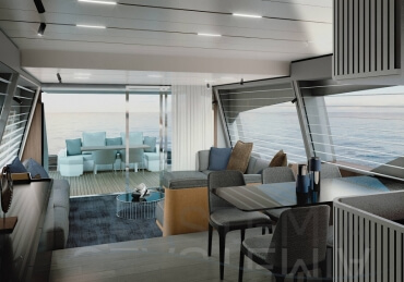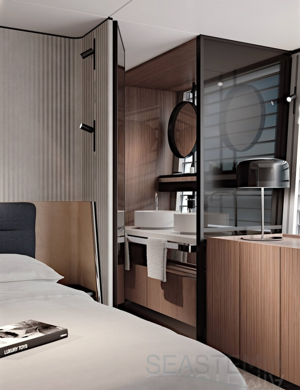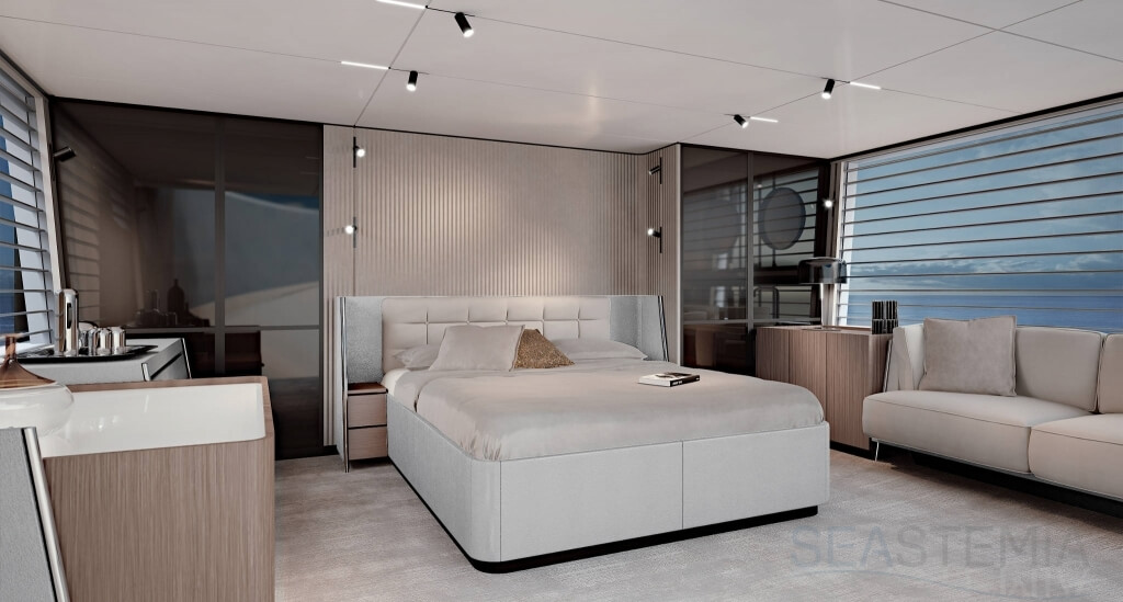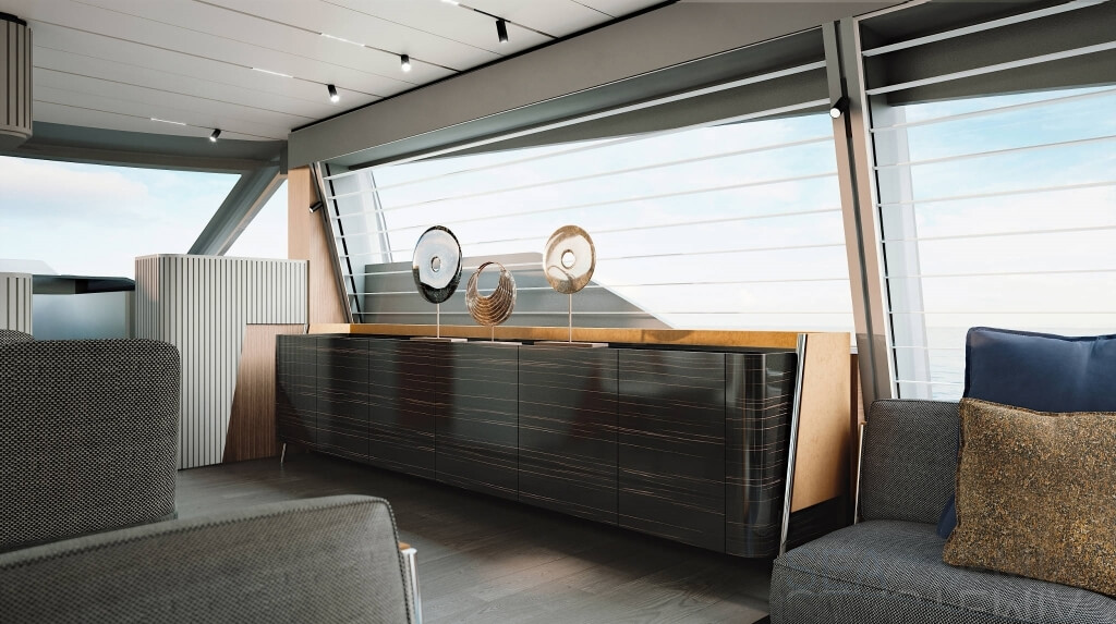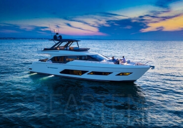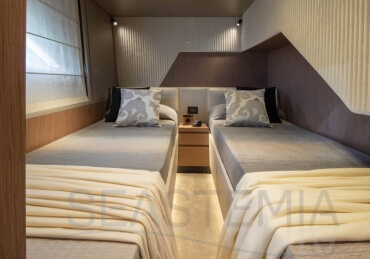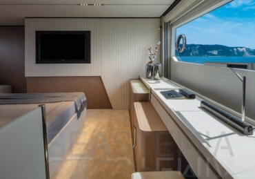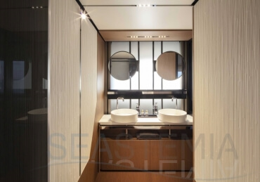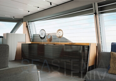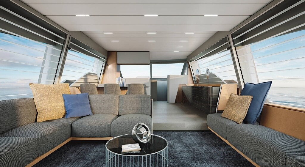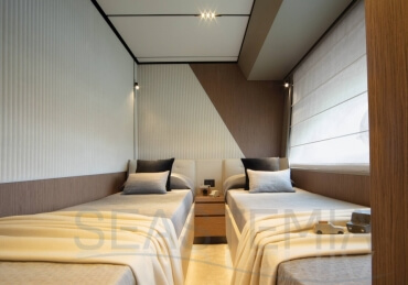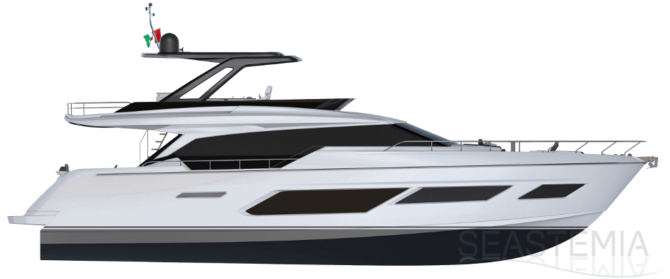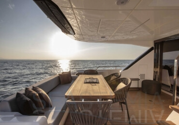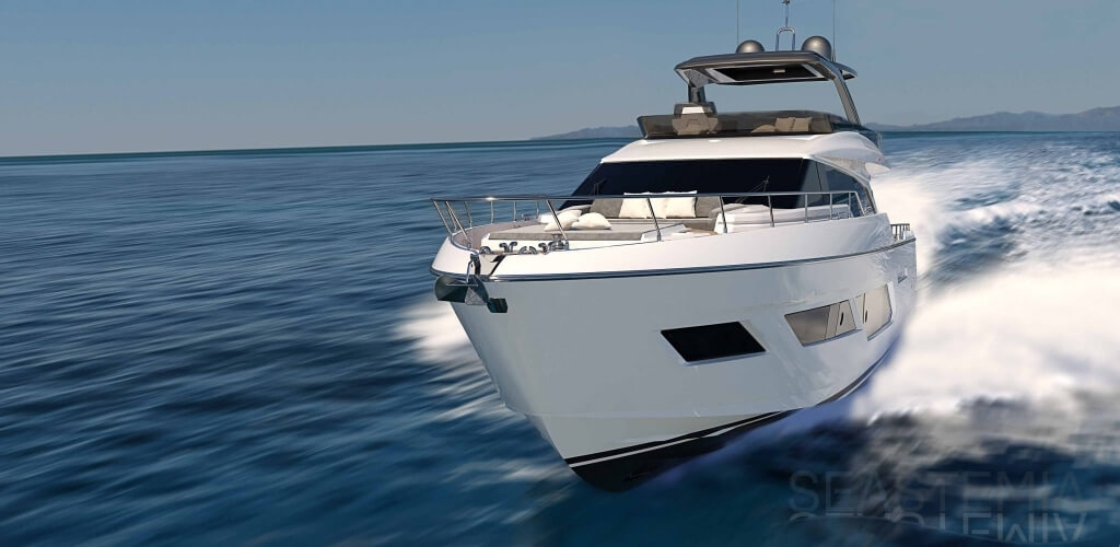 Shaped by architect Filippo Salvetti, who worked with Ferretti Group to devise the external design, this newest member of the fleet opens up a whole new way to experience the sea. The 720’s remarkably ingenious solutions elevate the concept of cruising in luxurious comfort to new heights. It’s about living the sea life in style, in your home on the waves, with all the comforts of a yacht of timeless elegance and a sensation of wellbeing like never before. The Ferretti Yachts 720 debuted at the 2019 Cannes Yachting Festival and caused an immediate stir. With her amazing spaces, unexpected headroom and abundance of areas to enjoy, she takes the cruising experience to a new level. She is the fruit of a partnership between our Product Strategy Committee and the Engineering department – the second yacht with external design by Salvetti and Ferretti Group, with interiors by our own architects and designers. The spacious master cabin echoes the play of colours and materials that grace the main deck, in a peerless private setting that’s a joy to discover. The minimalist yet detailed design provides a continual counterpoint to the walk-in wardrobe and the grand bathroom, where the smoked-glass inserts and functionality of form are in tune with current trends. The winning style of this desirable new model is based on a blend of contrasting textures. The striped ceiling, the ribbed surface of the walls, the grid-pattern headboards and the lounge furniture’s oblique-stripe motif play off one another in a profound natural harmony. The lighting design is an attribute that is unique to the 720. Horizontal LEDs integrate into the ceilings to create a soft, diffuse effect, while independent vertical spotlights with adjustable beams pick out original features with scenic flair. It all adds up to a sublime experience of genuine cruising comfort.