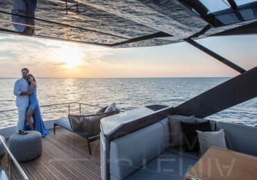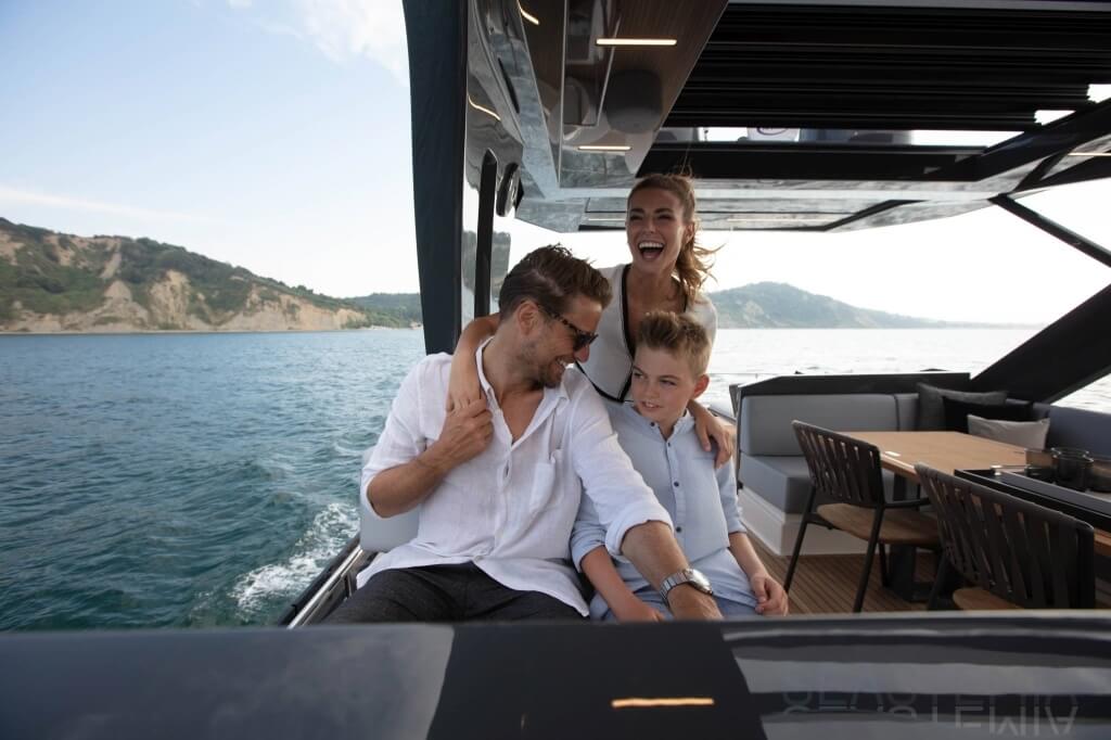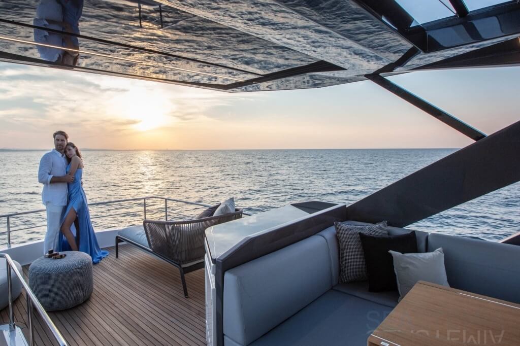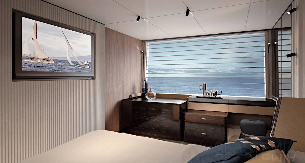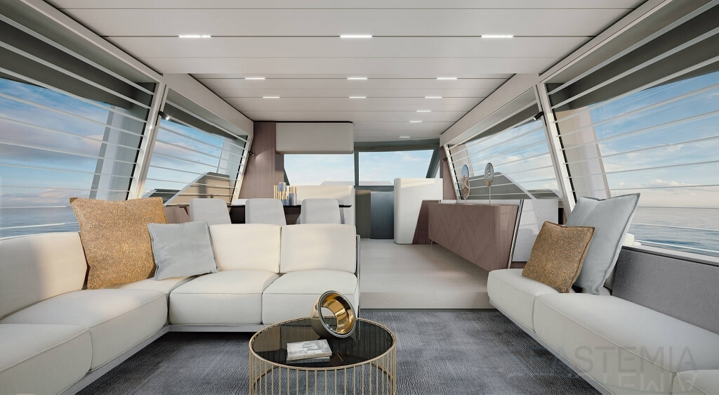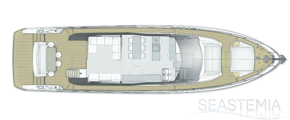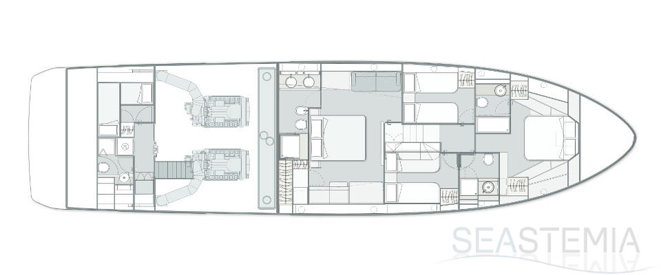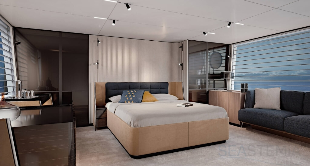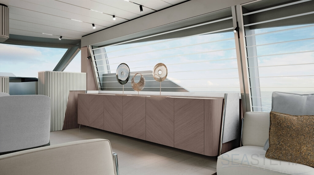 Shaped by architect Filippo Salvetti, who worked with Ferretti Group to devise the external design, this newest member of the fleet opens up a whole new way to experience the sea. The 720’s remarkably ingenious solutions elevate the concept of cruising in luxurious comfort to new heights. It’s about living the sea life in style, in your home on the waves, with all the comforts of a yacht of timeless elegance and a sensation of wellbeing like never before. The Ferretti Yachts 720 debuted at the 2019 Cannes Yachting Festival and caused an immediate stir. With her amazing spaces, unexpected headroom and abundance of areas to enjoy, she takes the cruising experience to a new level. She is the fruit of a partnership between our Product Strategy Committee and the Engineering department – the second yacht with external design by Salvetti and Ferretti Group, with interiors by our own architects and designers. The spacious master cabin echoes the play of colours and materials that grace the main deck, in a peerless private setting that’s a joy to discover. The minimalist yet detailed design provides a continual counterpoint to the walk-in wardrobe and the grand bathroom, where the smoked-glass inserts and functionality of form are in tune with current trends. The winning style of this desirable new model is based on a blend of contrasting textures. The striped ceiling, the ribbed surface of the walls, the grid-pattern headboards and the lounge furniture’s oblique-stripe motif play off one another in a profound natural harmony. The lighting design is an attribute that is unique to the 720. Horizontal LEDs integrate into the ceilings to create a soft, diffuse effect, while independent vertical spotlights with adjustable beams pick out original features with scenic flair. It all adds up to a sublime experience of genuine cruising comfort.