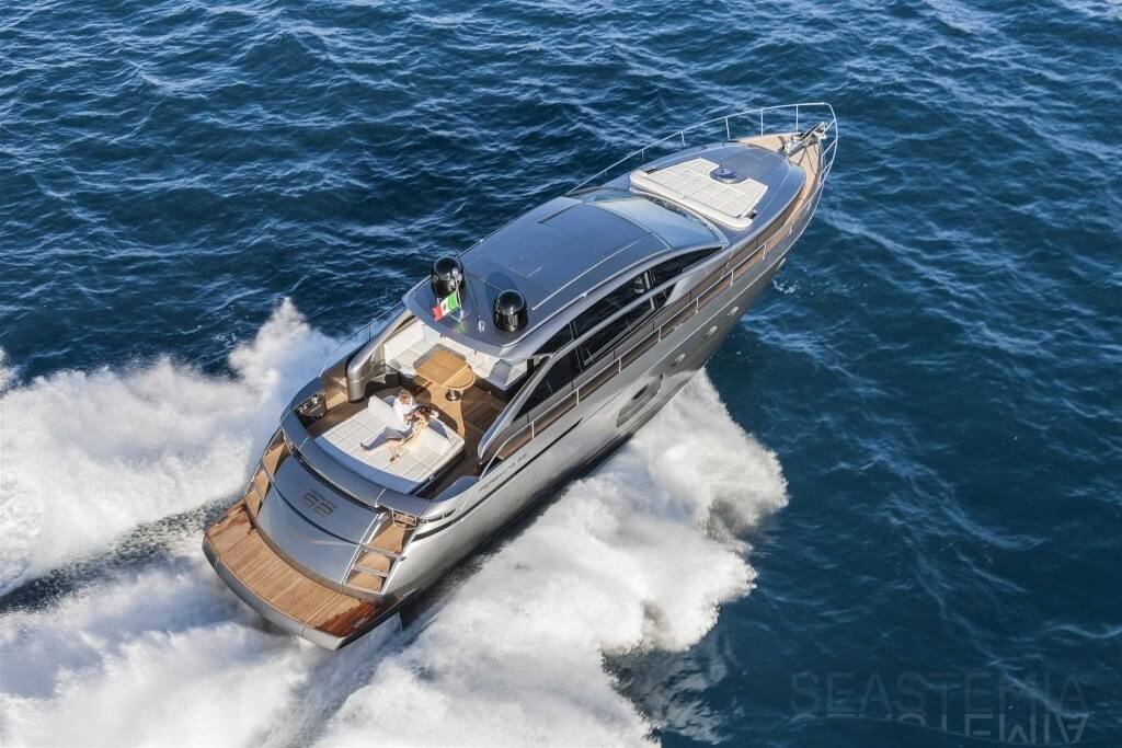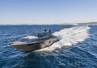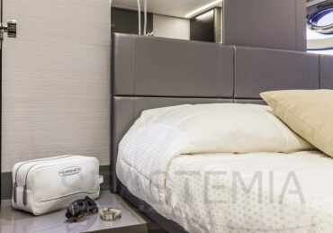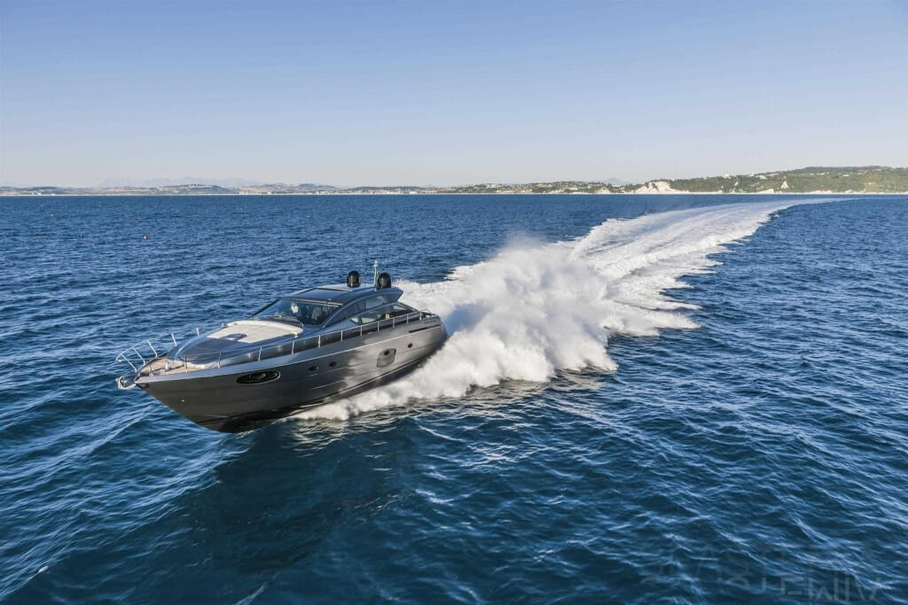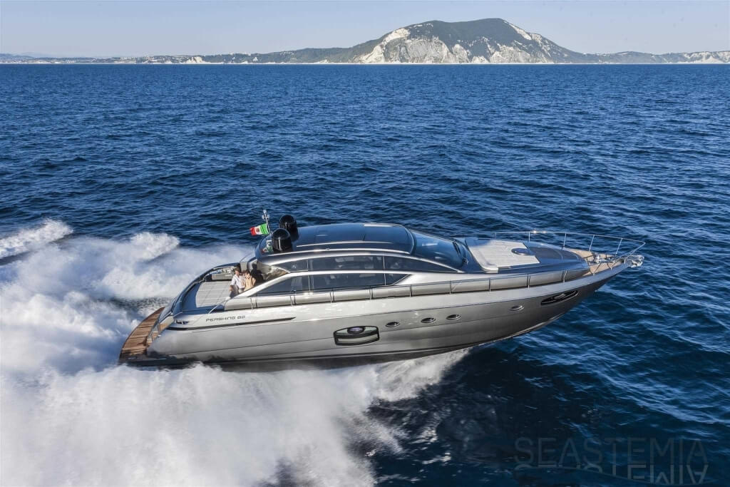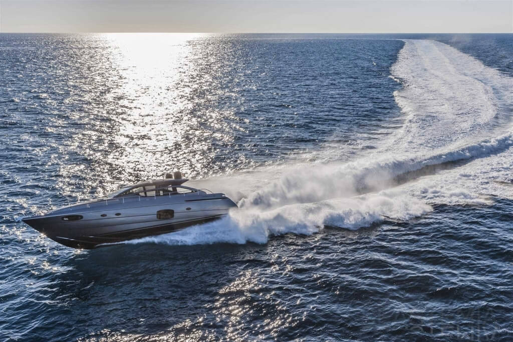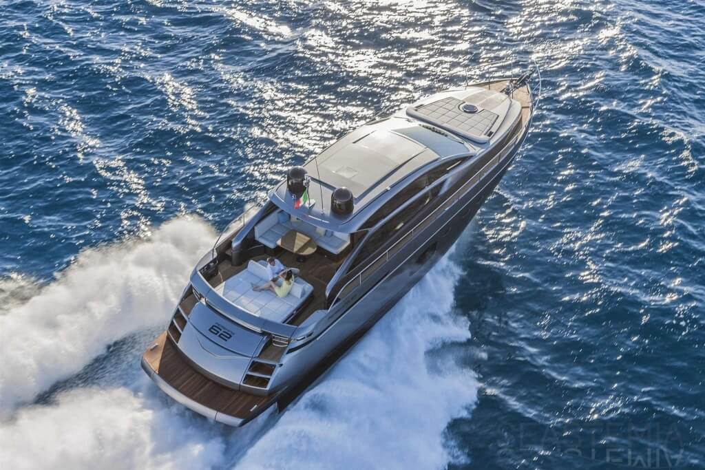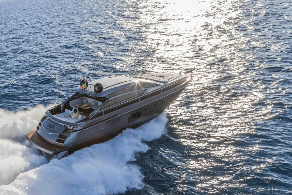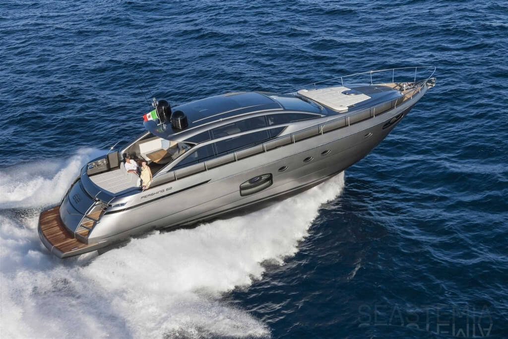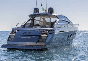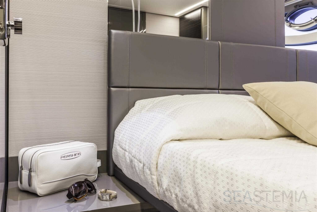 You can tell those who are unfamiliar with sailing, but love speed on the road behind the wheel of a Zonda Revolucion or a Bugatti Veyron. And if you want to explain to them how you feel cruising at 90 km/h (or better yet, in nautical terms, at over 46 knots) aboard a 33.35-ton boat, you are going to have to invite them on board. They will be elated by Pershing 62 before it even leaves the dock thanks to its streamlined and svelte looks and the hull windows that on the inside provide the lounge and master cabin with oceans of light. The master cabin is extremely luxurious and high-tech, as is the forward VIP cabin, which is also generously lit by a double window with porthole. Comfort, technology and speed merge together with the fun you will have cutting the waves as you easily reach the speed of 46.5 knots. And to get an idea of its handling, you can change course at 42 knots without ending up in a 180° spin while sitting on your comfortable and snug Poltrona Frau helmseat. The Pershing 62 is available in two versions: with three cabins and three bathrooms with separate shower, or with two cabins (master and VIP) with the guest cabin replaced by a lower deck dinette.