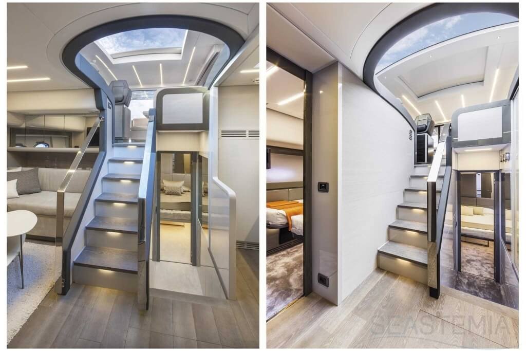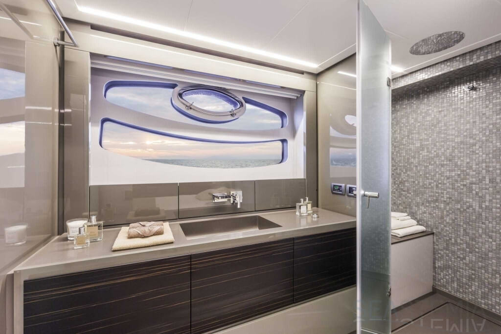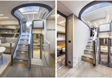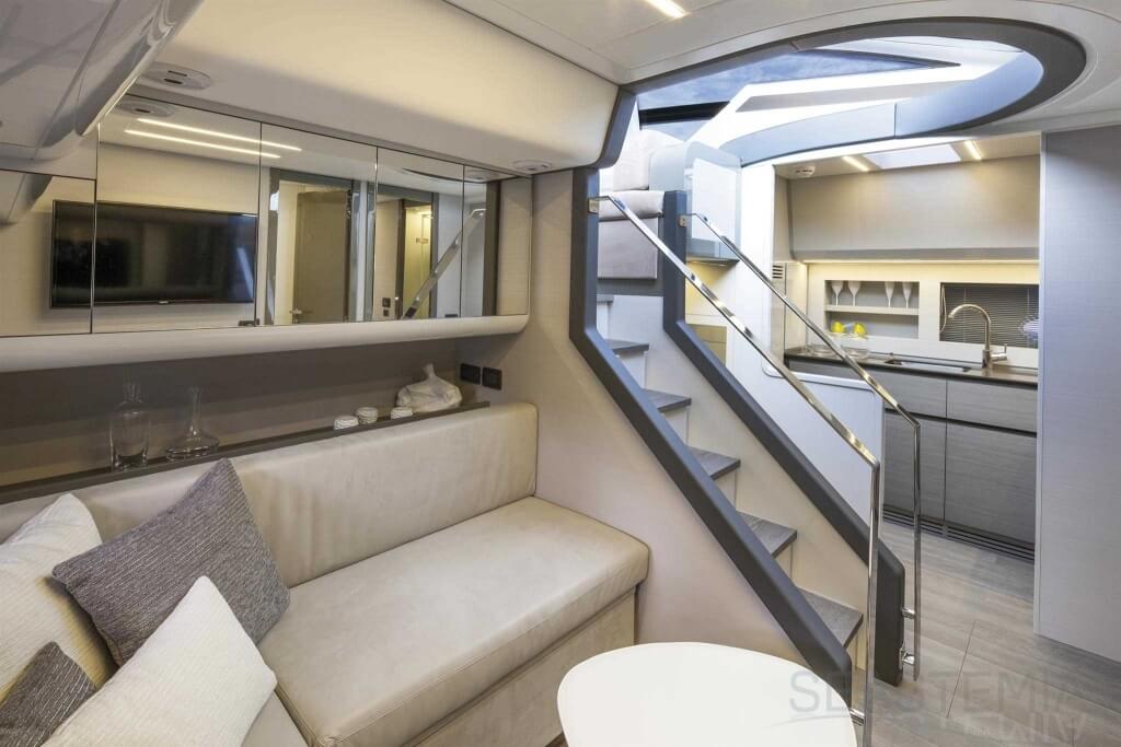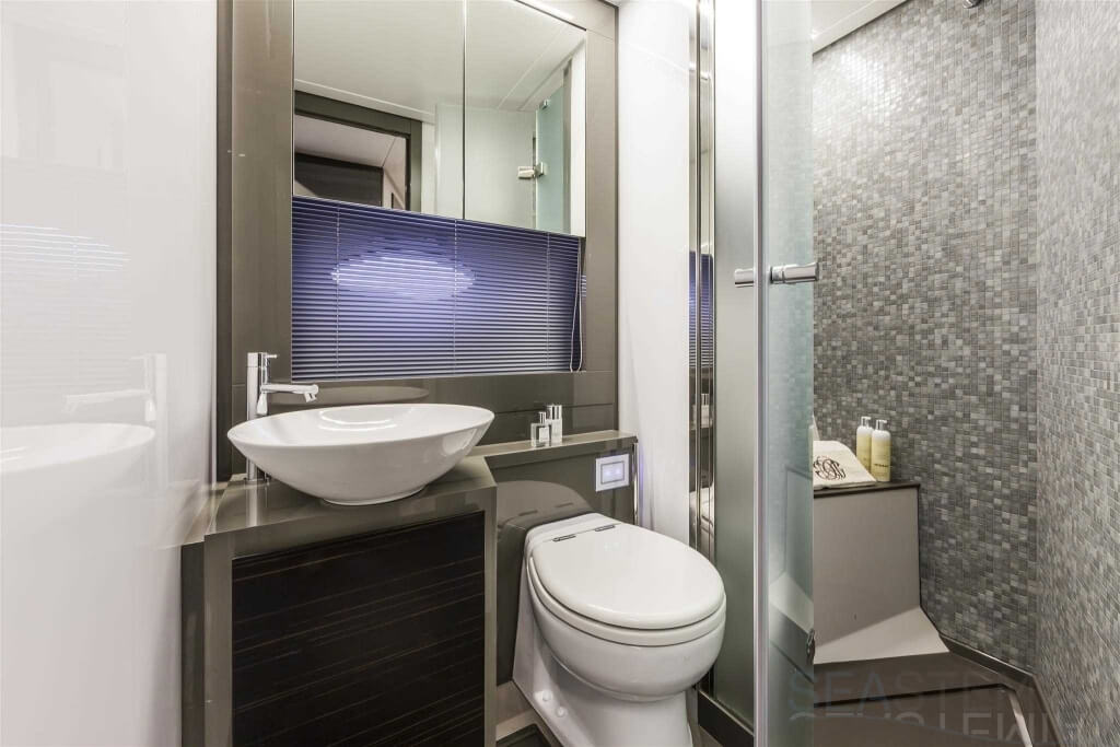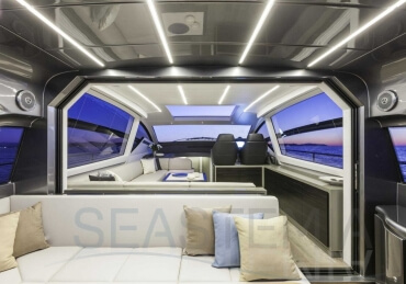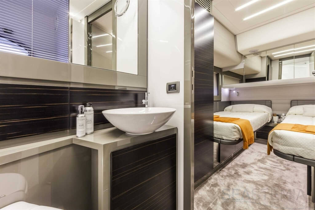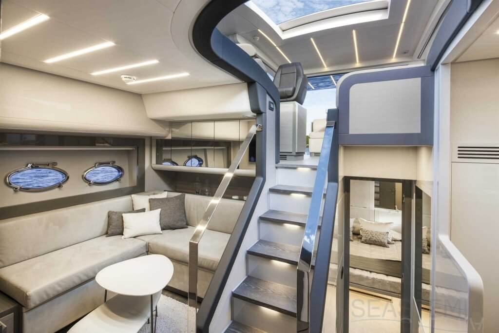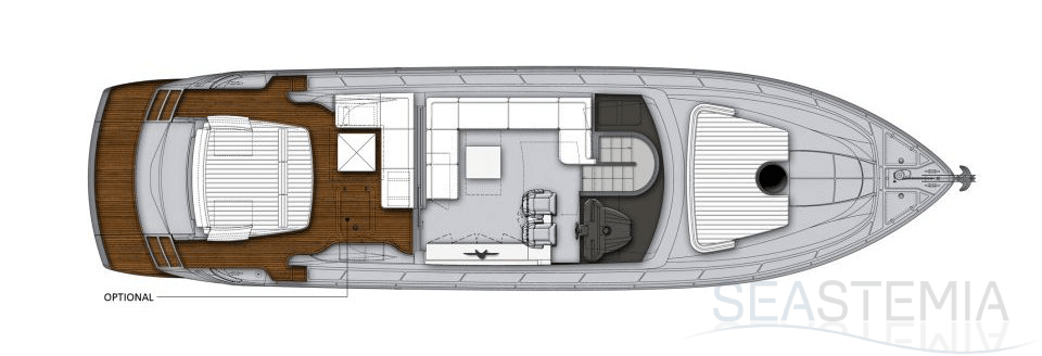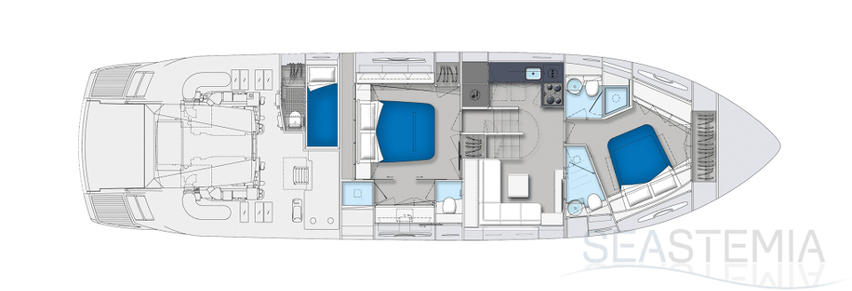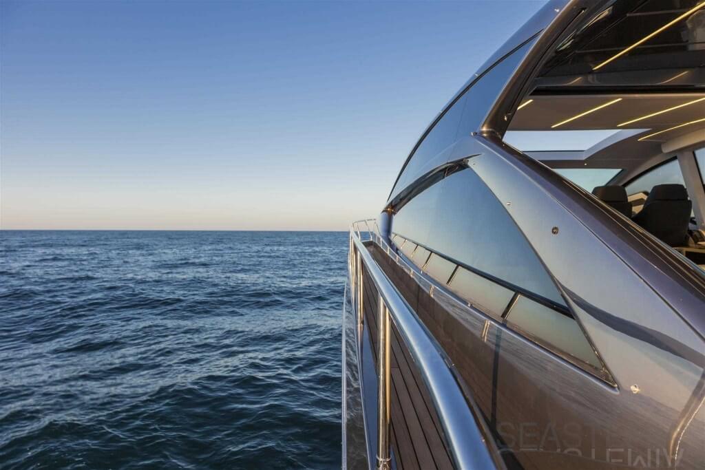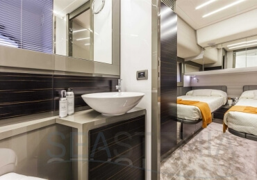 You can tell those who are unfamiliar with sailing, but love speed on the road behind the wheel of a Zonda Revolucion or a Bugatti Veyron. And if you want to explain to them how you feel cruising at 90 km/h (or better yet, in nautical terms, at over 46 knots) aboard a 33.35-ton boat, you are going to have to invite them on board. They will be elated by Pershing 62 before it even leaves the dock thanks to its streamlined and svelte looks and the hull windows that on the inside provide the lounge and master cabin with oceans of light. The master cabin is extremely luxurious and high-tech, as is the forward VIP cabin, which is also generously lit by a double window with porthole. Comfort, technology and speed merge together with the fun you will have cutting the waves as you easily reach the speed of 46.5 knots. And to get an idea of its handling, you can change course at 42 knots without ending up in a 180° spin while sitting on your comfortable and snug Poltrona Frau helmseat. The Pershing 62 is available in two versions: with three cabins and three bathrooms with separate shower, or with two cabins (master and VIP) with the guest cabin replaced by a lower deck dinette.